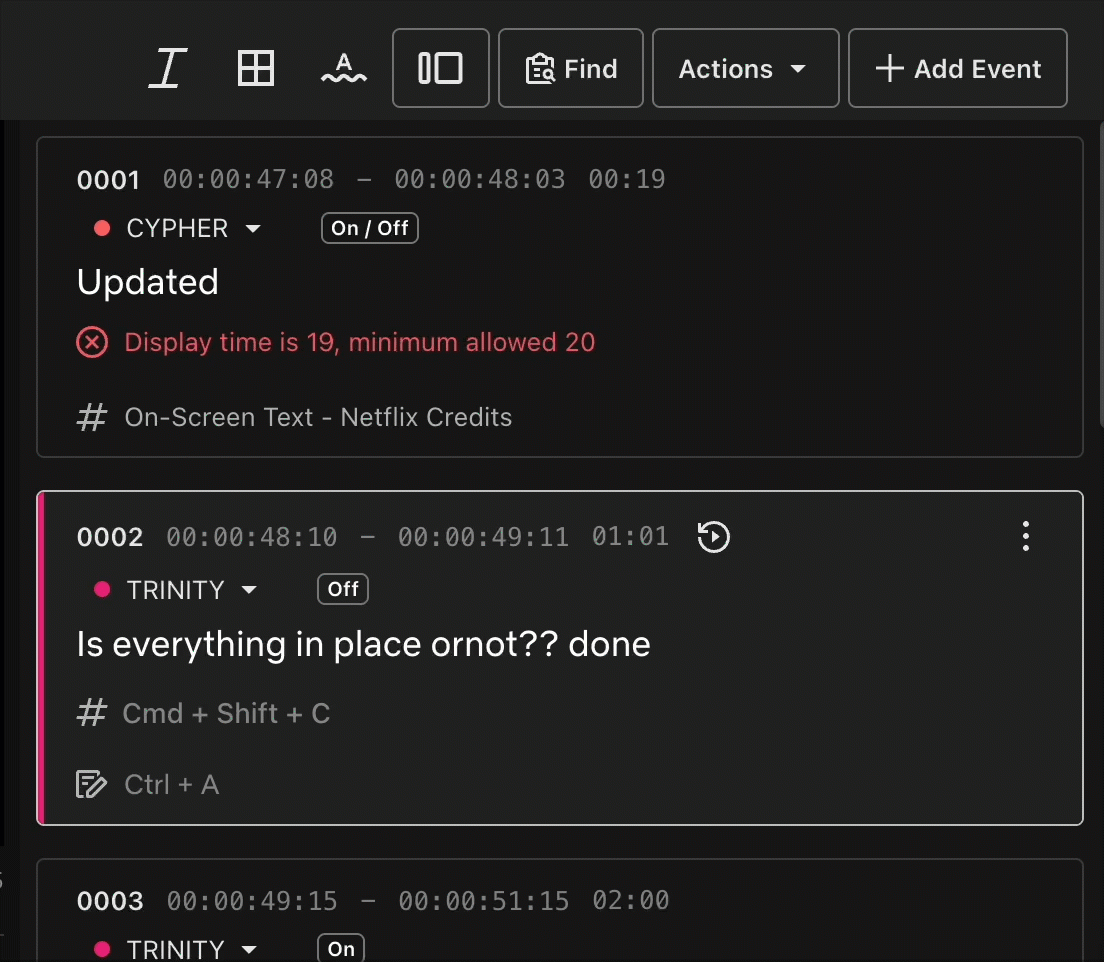 The image below reflects a Dialogue List (DL). A Pivot Language Dialogue List (PLDL) has the same layout, but the events panel will have 2 text fields: Transcription + Translation.