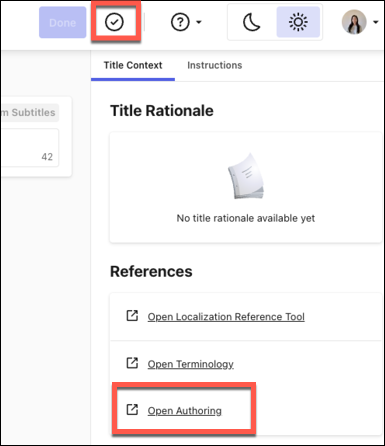 A link to the subtitle in Originator is now available in the Loc Editor under References (right-side), helping you verify and make decisions on suggested title translations.
