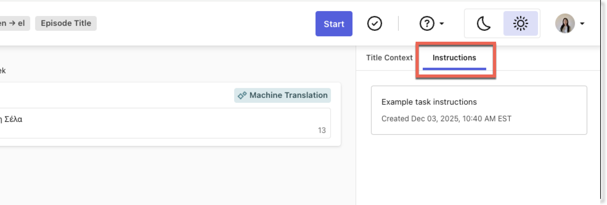 If available, you'll see Task Instructions for episode title tasks. You'll find them in the Linguist Dashboard and Localization Editor under Instructions, next to the Title Context tab.