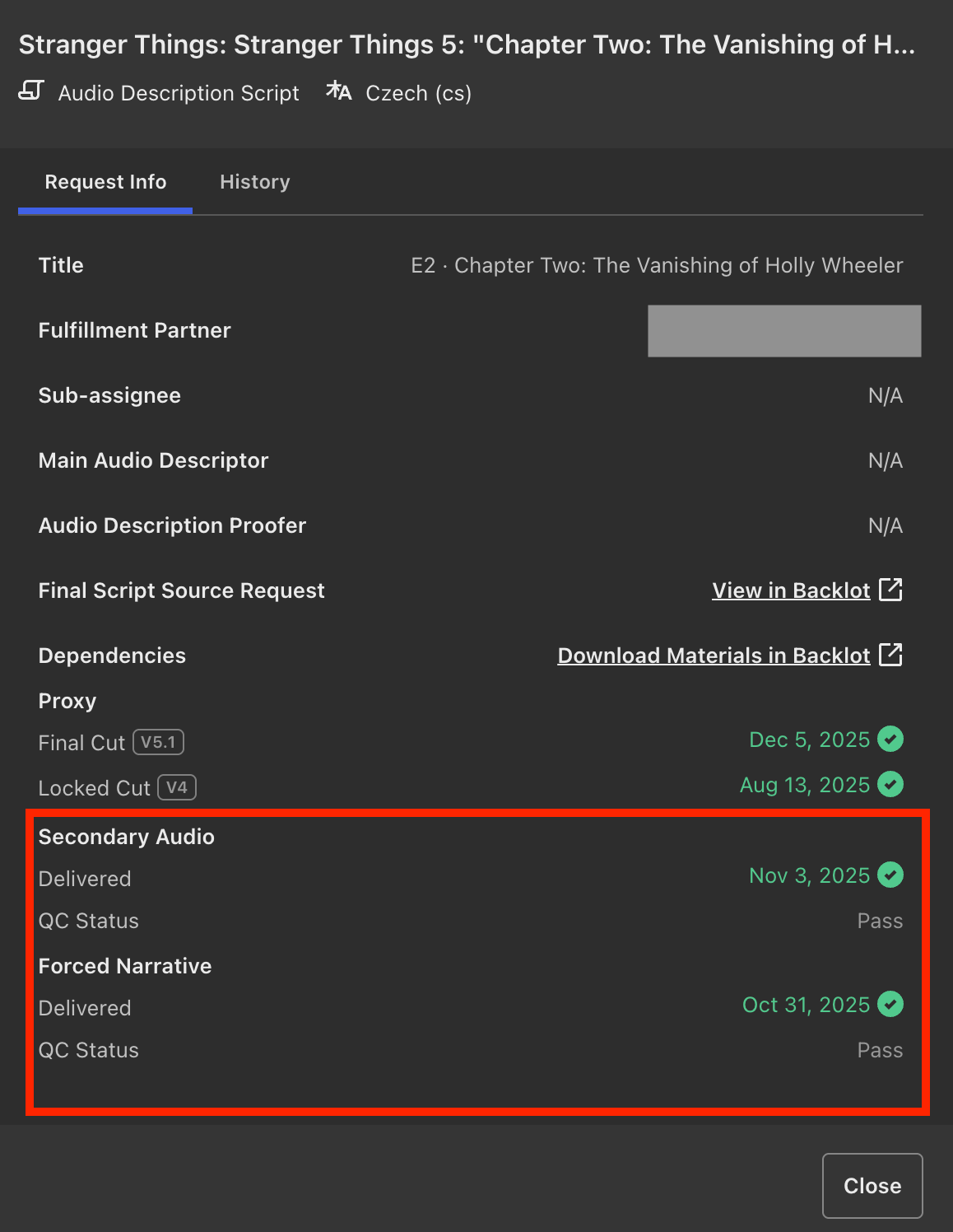 - You can now quickly validate the QC status of Forced Narrative and Secondary Audio assets directly from the QC Status column.