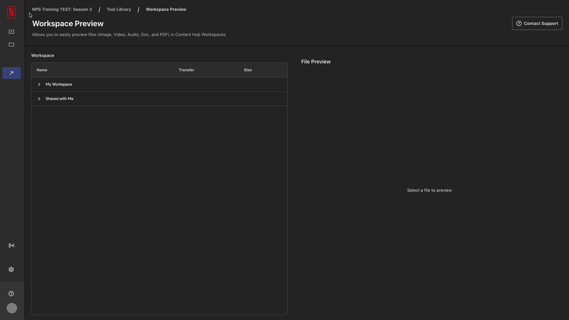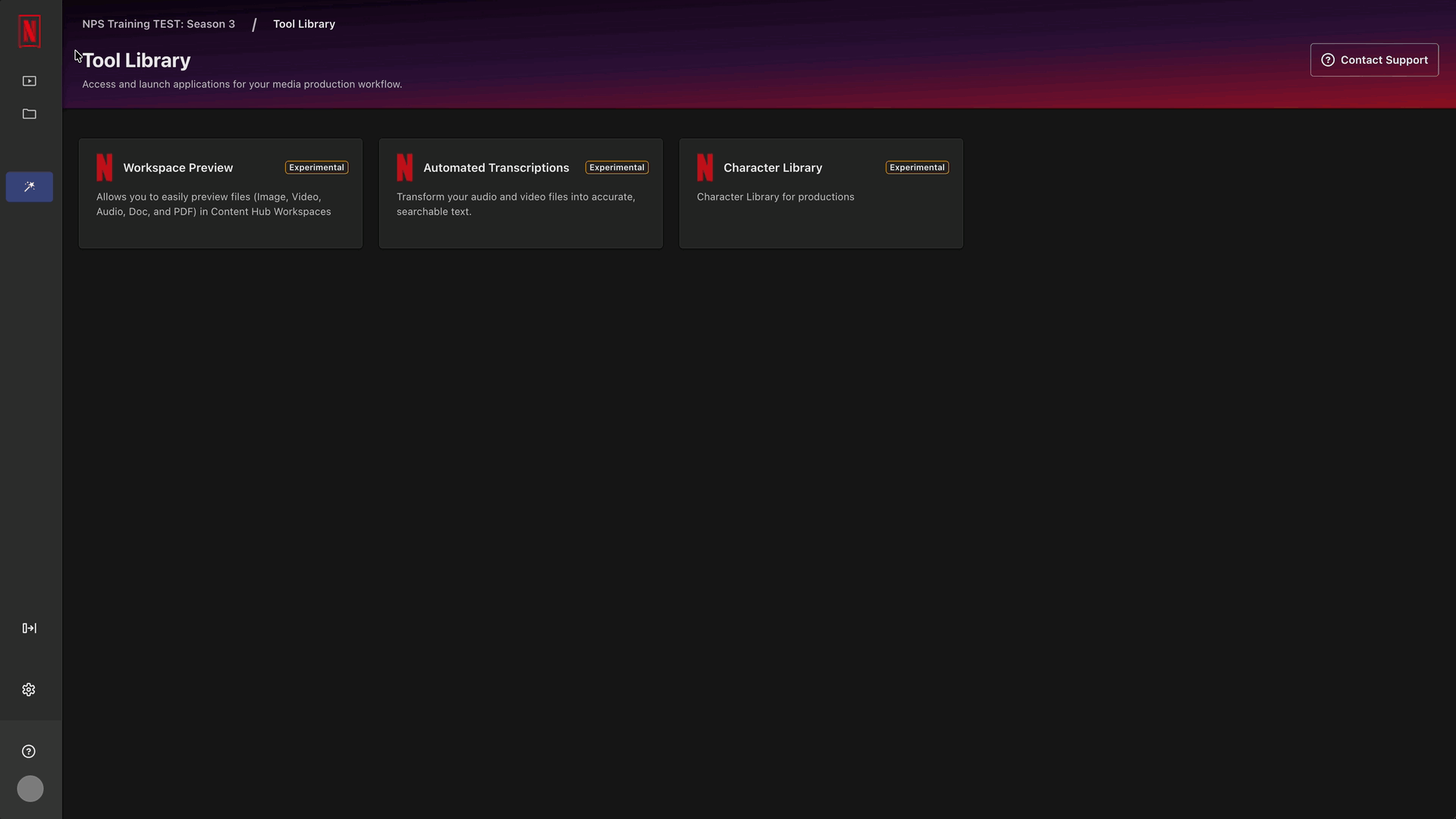 The Tool Library page provides a trusted workflow hub to streamline your access to a curated set of powerful tools provided by Netflix for Content Hub users. From the Tool Library page, users can browse, launch, and integrate high-value tools directly within Content Hub, with ongoing expansion planned to address evolving production needs and workflows.