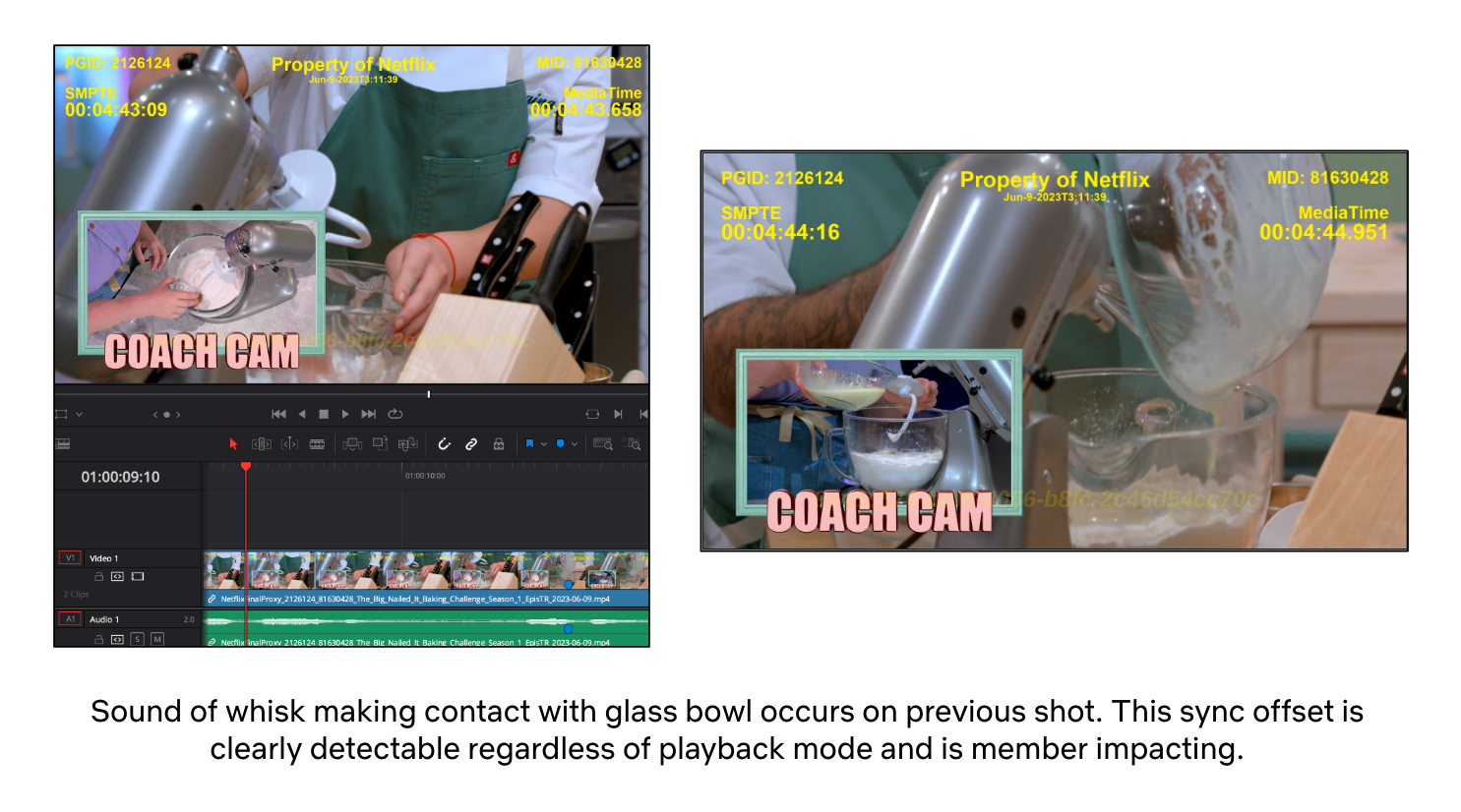 泡立て器がガラス製のボウルに接触する音が前のショットで発生します。この同期オフセットは、再生モードに関わらず明確に感知でき、メンバーに影響を与えます。