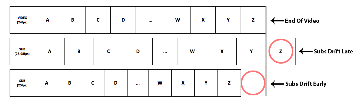 | 해결책 | 프레임 레이트를 조정하거나 타임라인 내 싱크를 수정한 후 필요에 따라 오디오를 다시 내보내기 합니다.텍스트 파일의 경우, 영상과 일치하도록 파일의 프레임 레이트를 변환합니다.텍스트 및 영상 파일의 프레임 레이트가 모두 23.976fps인 경우, SMPTE와 MEDIA 타임베이스 사이의 혼란으로 인해 오류가 발생했을 수 있습니다. 문제 해결에 더욱 자세한 기술 정보가 필요한 경우에는 자막 싱크 - 글로벌 싱크 드리프트 빠름(텍스트) 페이지를 참조하시기 바랍니다. |